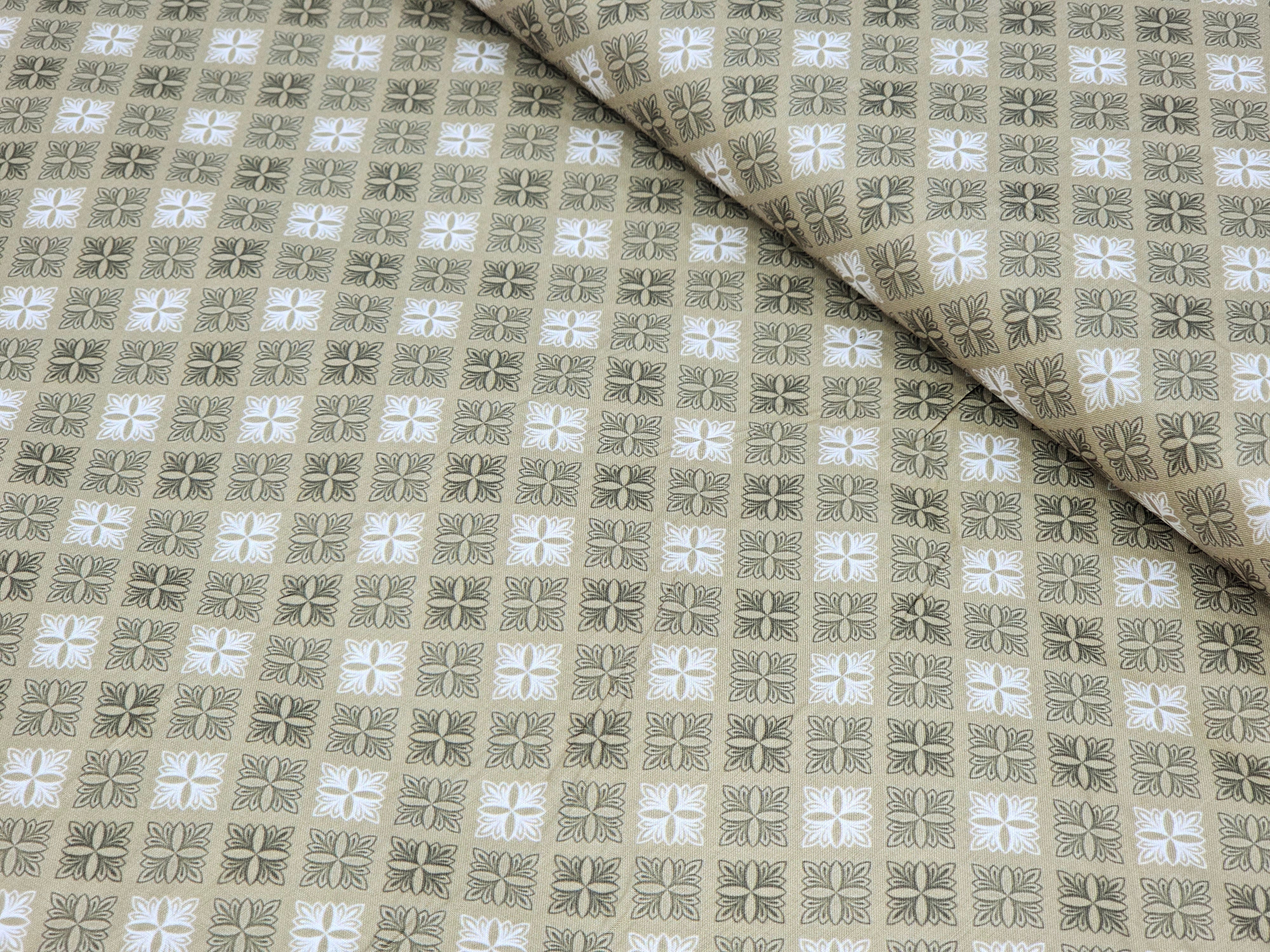 WHITE AND HENNA GREEN BLOCK PRINTED PREMIUM MIX COTTON SHIRT FABRIC.