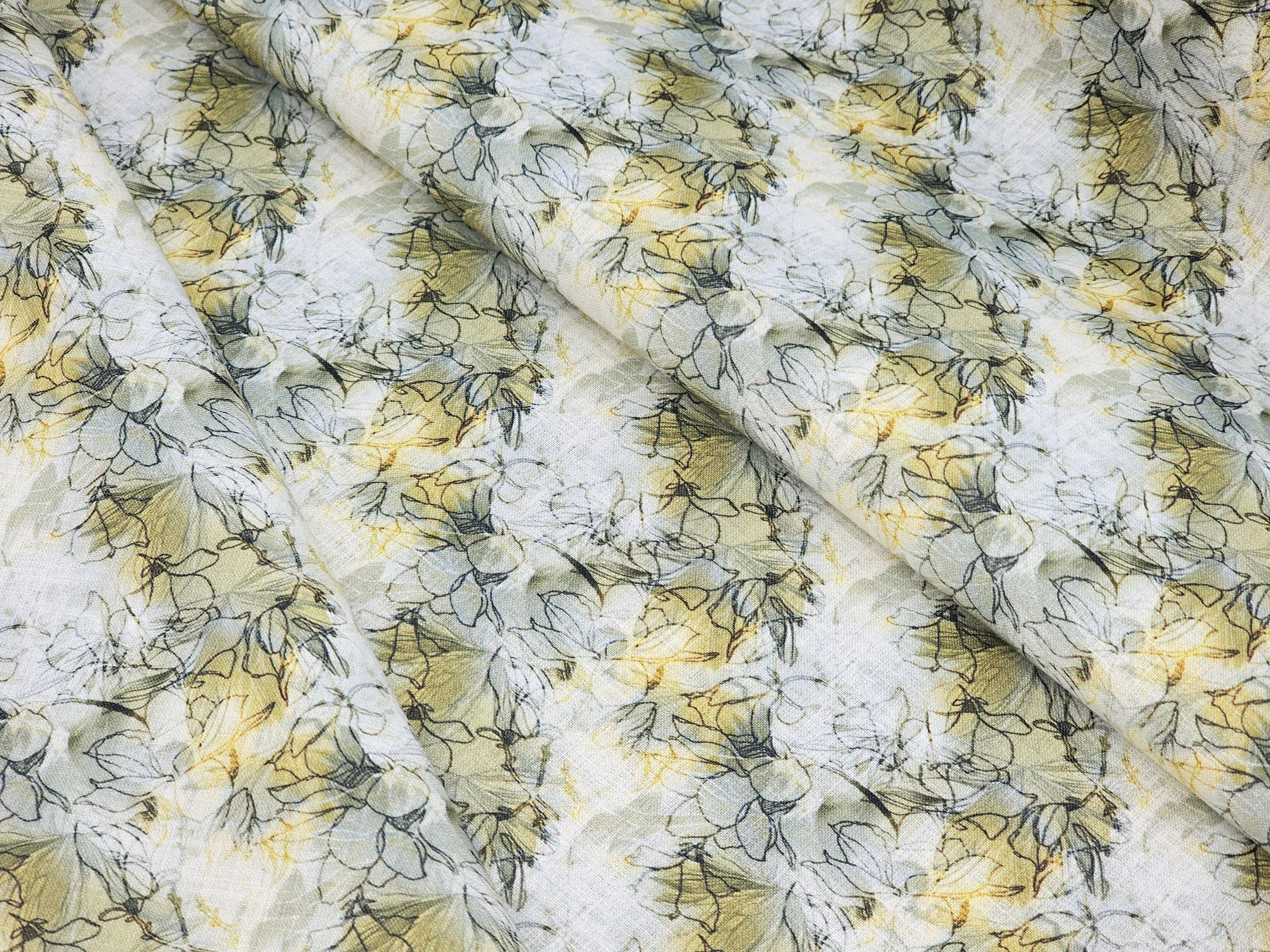 WHITE YELLOW GREEN FLORAL PRINTED PREMIUM MIX COTTON SHIRT FABRIC.